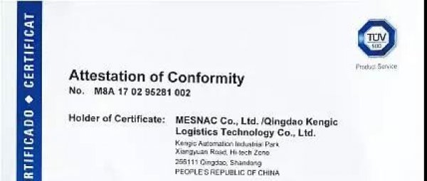 科捷交叉带分拣机获得欧盟市场通行证--CE认证证书
